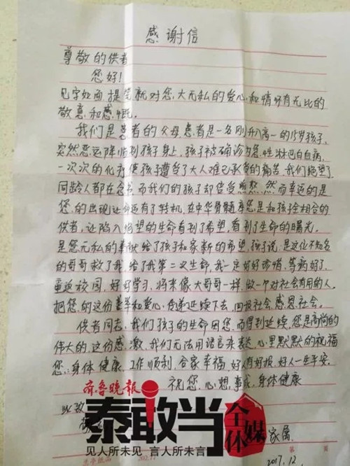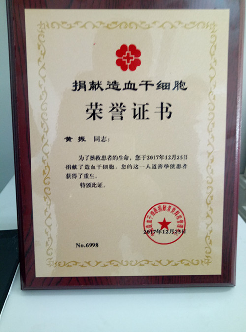 2017年12月25日,山東大學(xué)齊魯醫(yī)院造血干細(xì)胞采集中心,山東省第595例,泰安市第15例造血干細(xì)胞捐獻(xiàn)者是來自山東康平納集團(tuán)員工黃振。接受捐獻(xiàn)的是一名剛剛15歲正在上高一的女孩。