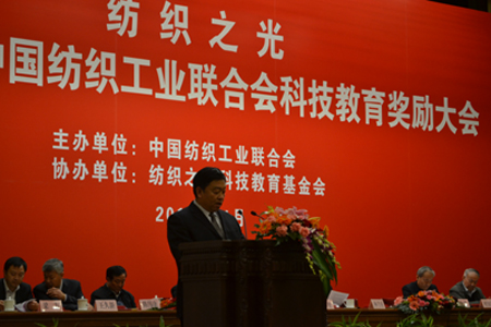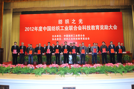 2012年11月29日,“紡織之光”2012年度中國紡織工業(yè)聯(lián)合會(huì)科技教育獎(jiǎng)勵(lì)大會(huì)在北京人民大會(huì)堂舉行。本次獎(jiǎng)勵(lì)大會(huì)共有受獎(jiǎng)勵(lì)項(xiàng)目171項(xiàng),其中13項(xiàng)成果榮獲科技進(jìn)步一等獎(jiǎng)。集團(tuán)公司項(xiàng)目“筒子紗數(shù)字化自動(dòng)染色成套技術(shù)與裝備”榮獲紡織工業(yè)聯(lián)合會(huì)科技進(jìn)步一等獎(jiǎng)。董事長陳隊(duì)范上臺(tái)領(lǐng)獎(jiǎng)并作為受獎(jiǎng)企業(yè)唯一代表發(fā)言。王天凱會(huì)長等協(xié)會(huì)領(lǐng)導(dǎo)對(duì)康平納數(shù)十年來產(chǎn)業(yè)結(jié)構(gòu)的調(diào)整予以充分肯定,高度評(píng)價(jià)了康平納項(xiàng)目對(duì)推動(dòng)紡織行業(yè)進(jìn)步的巨大作用。