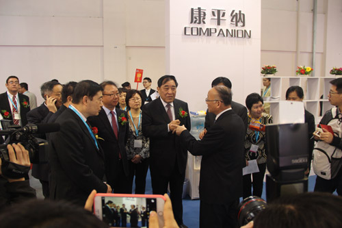 康平納集團副總經(jīng)理鹿慶福為中國紡織工業(yè)聯(lián)合會王天凱會長、孫瑞哲副會長等領(lǐng)導(dǎo)介紹公司參展情況